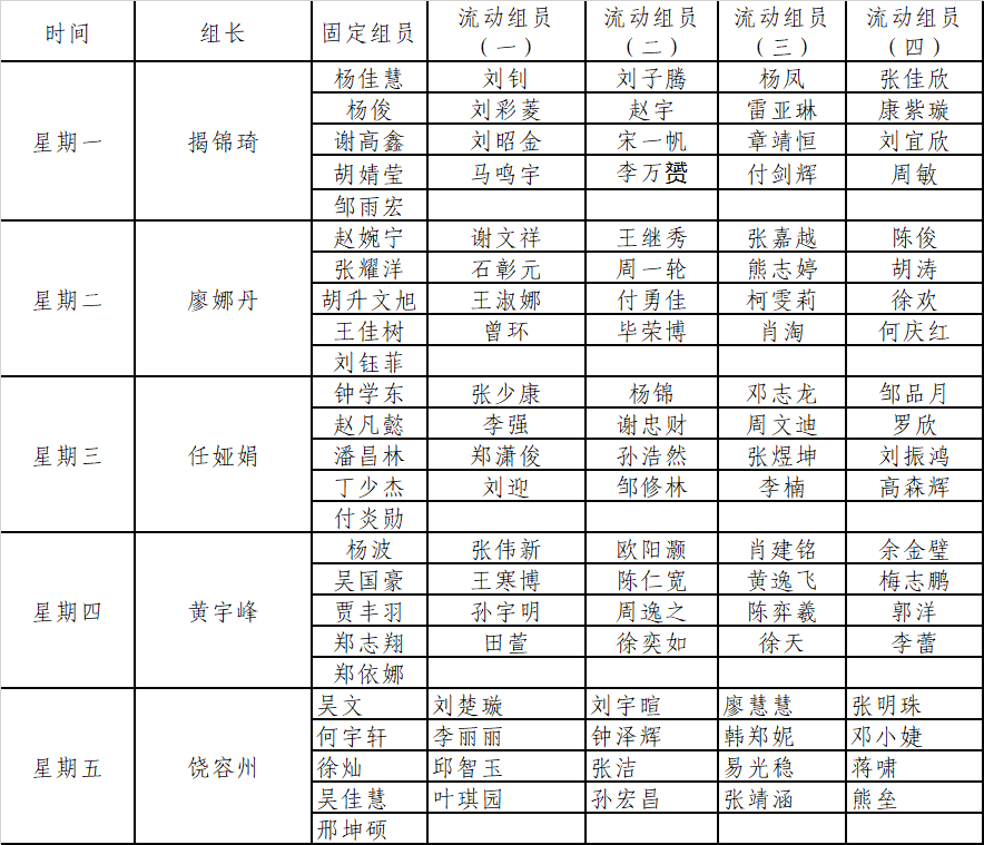 每组设立组长一名,负责统筹协调小组工作,定期向老师汇报工作进展。小组成员分成五个小组,每天安排一组进行监督工作,每组负责一天的课堂纪律监督任务。每个小组内部再进行具体分工。一个小组(组长+组员)共十人,四周一个周期循环。现将威廉williamhill2024年秋季学期课堂纪律监督小组名单及安排公布如下。