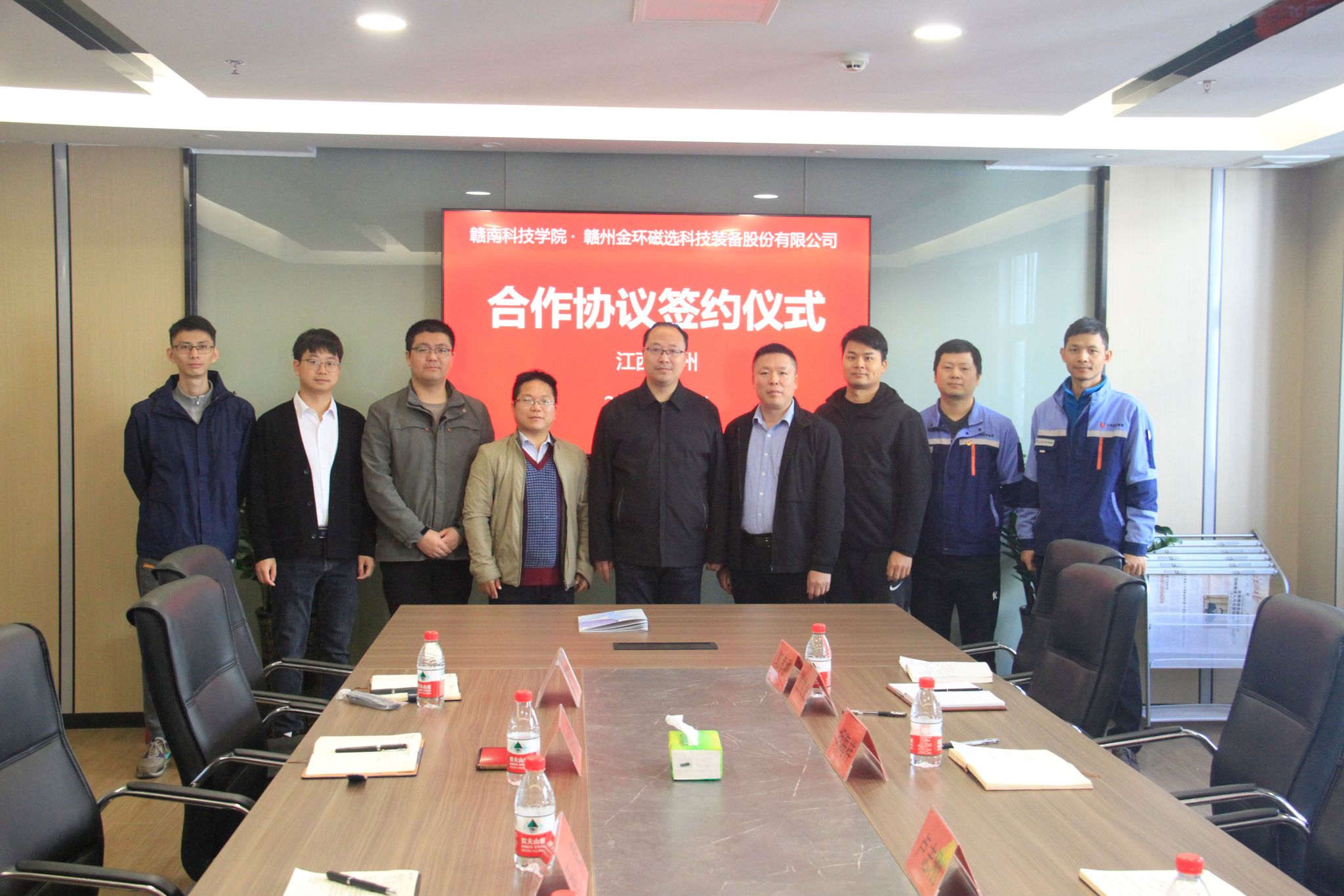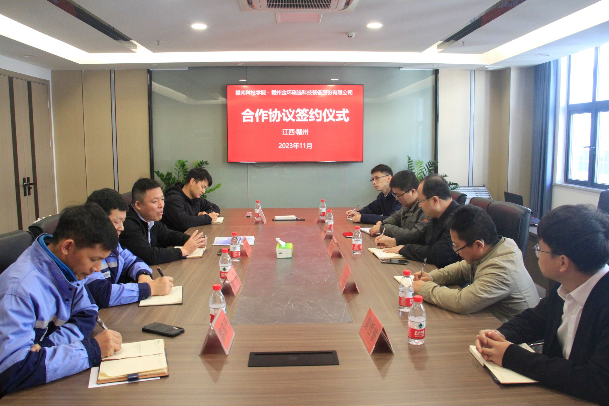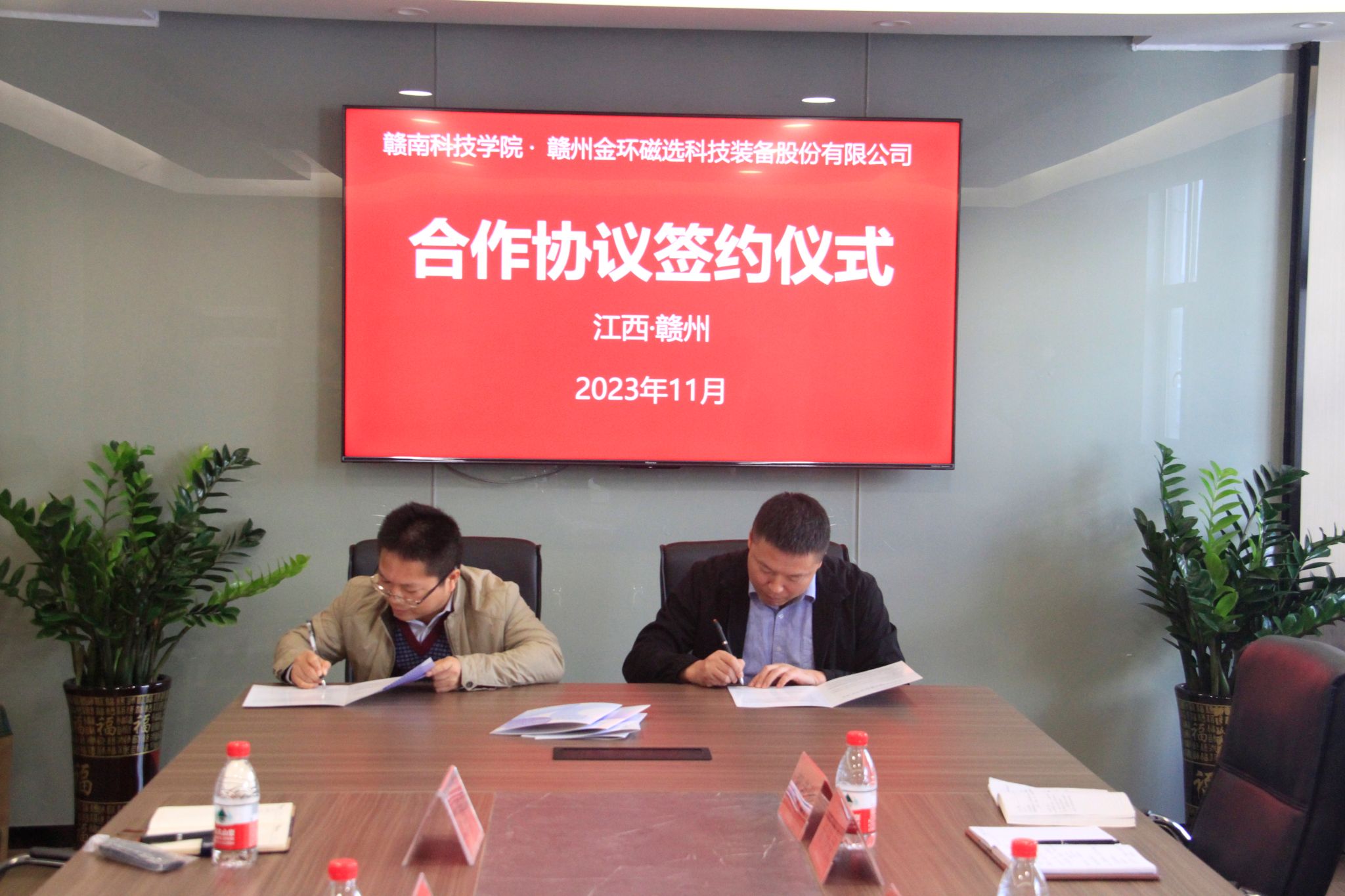 本网讯:11月17日,我校建设工程系主任卢志刚、科研办主任胡海祥一行赴赣州金环磁选科技装备股份有限公司(下称“金环磁选公司”)考察调研,金环磁选公司副总经理任祥君热情接待了卢志刚一行,双方在公司会议室举行了校企产教融合合作协议签约仪式。