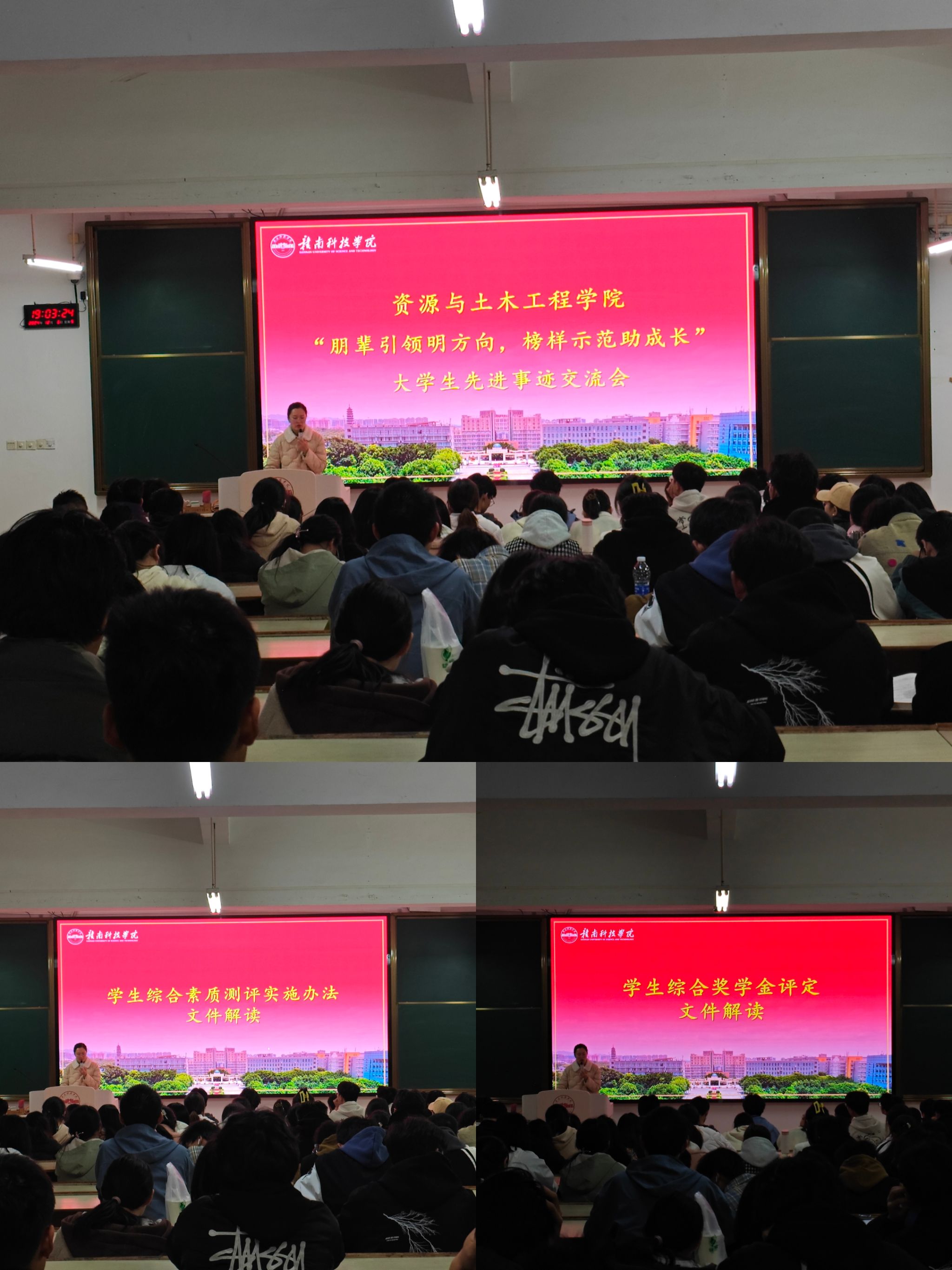 本网讯:为推动形成崇尚先进、争当表率的良好氛围。12月6日晚,威廉williamhill于崇善楼Z1D3教室举行主题为“朋辈引领明方向,榜样示范助成长”的大学生先进事迹交流会。辅导员邱麟惠及300余名学生共同参与此次交流会。