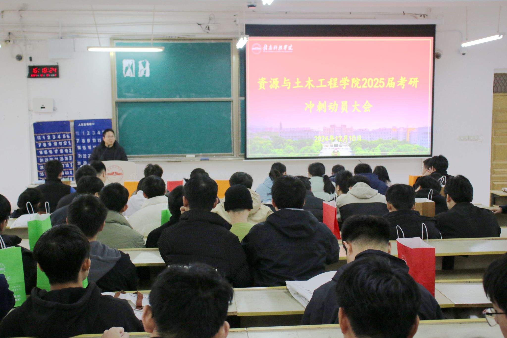 卢志刚介绍了近年来考研情况。他以详实的数据为依托,详细阐述了考研的必要性与重要性,深入分析近年来考研的考录比及不同科目的分数线,让学子们对考研形势有了更为清晰的认知。卢志刚还详细介绍了考研政策,从报名流程到考试环节,从学院历年考研录取率到备考策略,为学子们指明了冲刺方向。他鼓励同学们要精准分析自身优劣条件,合理制定复习计划,科学高效备考。卢志刚寄语学院学子,考研是一场意义非凡的人生挑战,同学们需坚定信念、勇往直前,以饱满的热情与昂扬的斗志投入到最后的冲刺阶段,以积极乐观的心态迎接即将到来的考试。