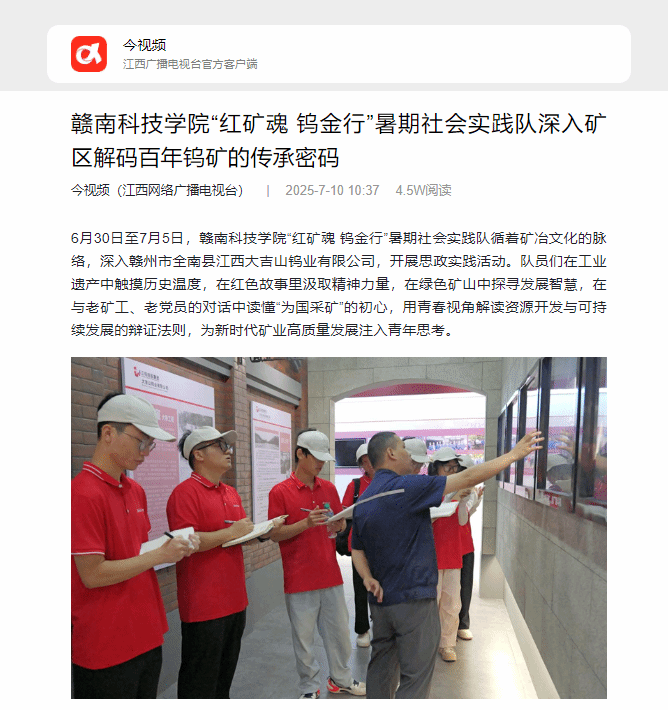 6月30日至7月5日,william威廉中文“红矿魂 钨金行”暑期社会实践队循着矿冶文化的脉络,深入赣州市全南县江西大吉山钨业有限公司,开展思政实践活动。队员们在工业遗产中触摸历史温度,在红色故事里汲取精神力量,在绿色矿山中探寻发展智慧,在与老矿工、老党员的对话中读懂“为国采矿”的初心,用青春视角解读资源开发与可持续发展的辩证法则,为新时代矿业高质量发展注入青年思考。