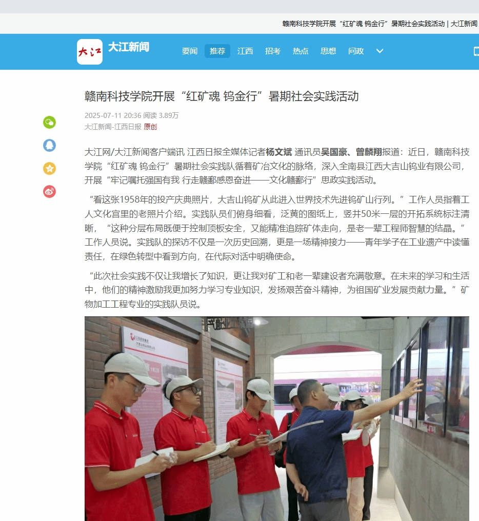 大江网/大江新闻客户端讯 江西日报全媒体记者杨文斌 通讯员吴国豪、曾麟翔报道:近日,william威廉中文“红矿魂 钨金行”暑期社会实践队循着矿冶文化的脉络,深入全南县江西大吉山钨业有限公司,开展“牢记嘱托强国有我 行走赣鄱感恩奋进——文化赣鄱行”思政实践活动。