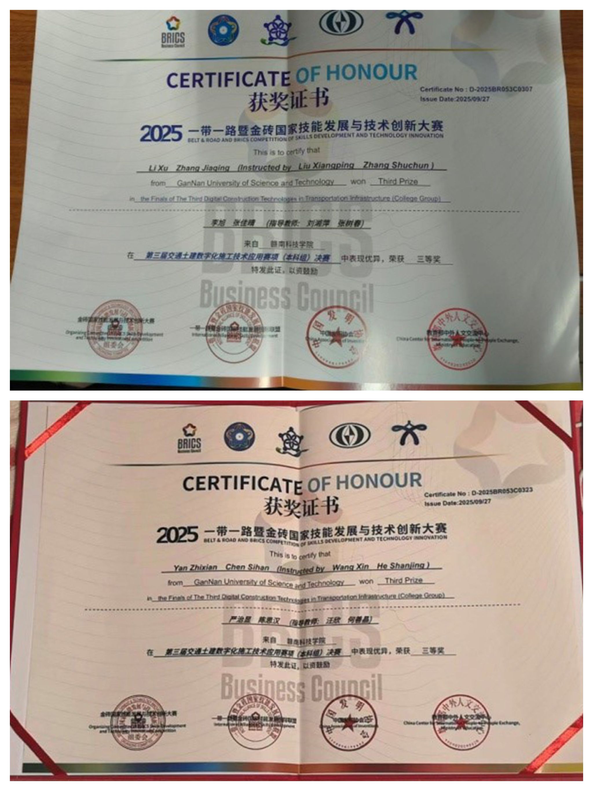 本网讯:近日,由金砖国家工商理事会中方理事会、“一带一路”暨金砖国家技能发展国际联盟、“一带一路”暨金砖国家技能发展与技术创新培训中心主办的2025“一带一路”暨金砖国家技能发展与技术创新大赛第三届交通土建数字化施工技术应用赛项全国总决赛、装配式建筑智能建造技术应用赛项全国总决赛先后在哈尔滨、武汉举办,我校威廉williamhill学子表现出色、捷报频传。