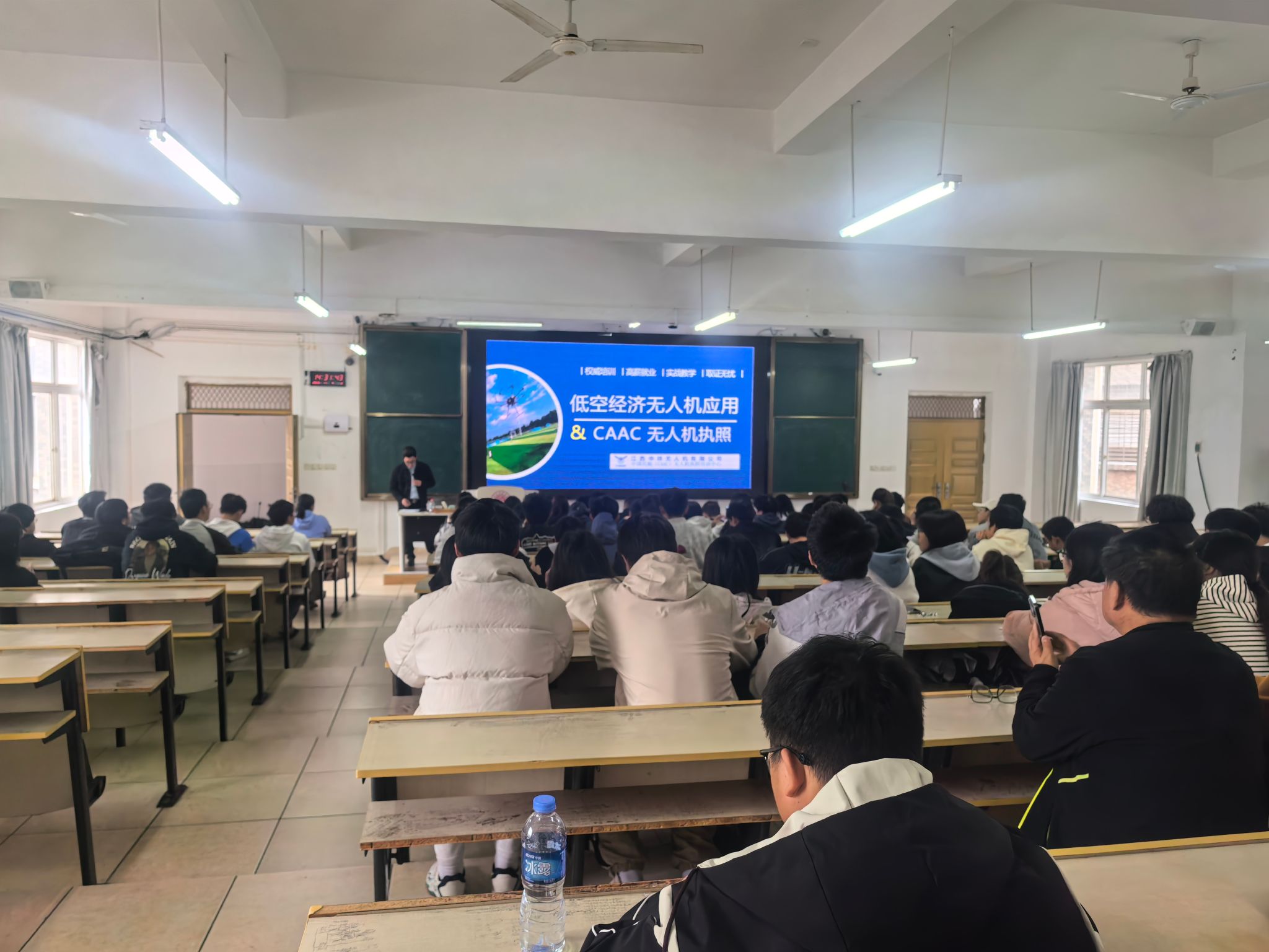 宣讲过程中,廖小建老师以“低空经济下无人机的应用与职业发展”为核心,从行业趋势、技术应用、证书价值三个维度展开讲解。在无人机应用场景部分,他结合实际案例,详细介绍了无人机在资源勘探、土木工程测绘、应急救援、物流运输等领域的具体应用——例如在矿产资源调查中,无人机可通过航拍与数据建模快速获取地形信息,大幅提升勘探效率;在建筑工程施工中,无人机能实时监测施工进度与安全隐患,为工程管理提供精准数据支持。这些贴近专业、贴合行业的内容,让学生们对无人机技术与低空经济的融合发展有了更直观的认知。
