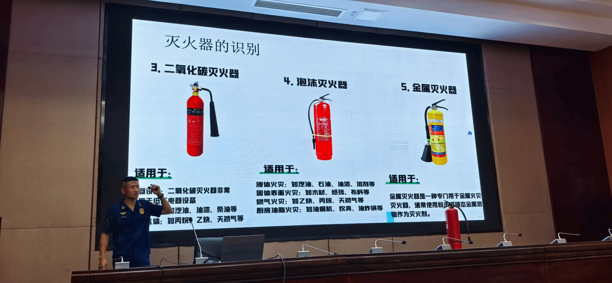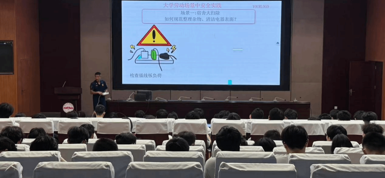 讲座伊始,俞家宝以自身丰富的消防救援经验为依托,分享消防员日常训练、救援的劳动场景,生动阐述劳动与安全相辅相成的关系。他通过互动提问引导学生思考消防员不保养装备、不清理消防通道的严重后果,同步展示大学生在实验室打扫未关电源、宿舍清理堵塞逃生通道等典型安全隐患,为在场师生敲响安全警钟。在劳动教育环节,他从消防员视角解读劳动的意义与安全责任,强调大学生在劳动中肩负的安全使命,针对宿舍大扫除、实验室清洁维护、食堂突发状况等常见场景,细致讲解劳动技能与安全操作要点,并借助“隐患找茬”互动游戏,加深学生对安全隐患的识别能力,培养“三关一查”的随手安全习惯。作为讲座的重点内容,消防安全篇聚焦灭火器识别使用、火灾逃生技巧、逃生面罩佩戴、绳结逃生法、地震自救及AED使用等知识,俞家宝通过现场演示和模拟场景,让同学们直观掌握自救互救技能。
