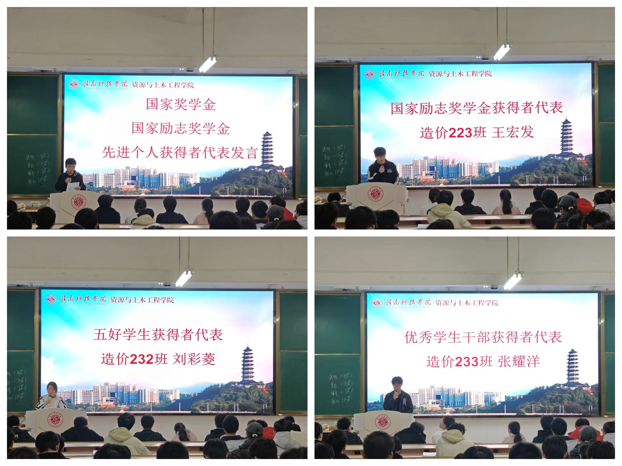优秀学生代表发言环节中,九位不同领域的优秀学子登台分享,以亲身经历传递奋斗力量,为在场同学点亮前行航向。国家奖学金获得者、测绘232班张少康拆解高效学习与科研方法,解锁“深耕学业、勇攀高峰”的成长密码;国家励志奖学金获得者、造价223班王宏发分享逆风成长故事,诠释自强不息的精神内涵,引发全场共鸣。此外,五好学生代表刘彩菱、优秀学生干部代表张耀洋、学习进步先进个人朱福莲、体育工作先进个人王定新、社会工作先进个人全佳乐、社团工作先进个人杨欣怡、志愿服务先进个人钟学东,分别从全面发展、责任担当、自我突破、体育精神、实践服务、能力提升、爱心奉献等维度分享宝贵经验。九位学子以鲜活事迹展现威廉williamhill学子笃实奋进、全面发展的青春风采,树立可感可学的榜样,传递“不负韶华、逐梦前行”的青春正能量。