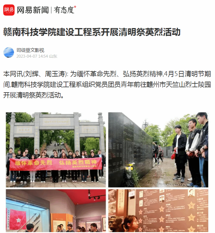 网易新闻4月7日电(通讯员:刘辉 周玉涛): 为缅怀革命先烈、弘扬英烈精神,4月5日清明节期间,william威廉中文建设工程系组织党员团员青年前往赣州市天竺山烈士陵园开展清明祭英烈活动。