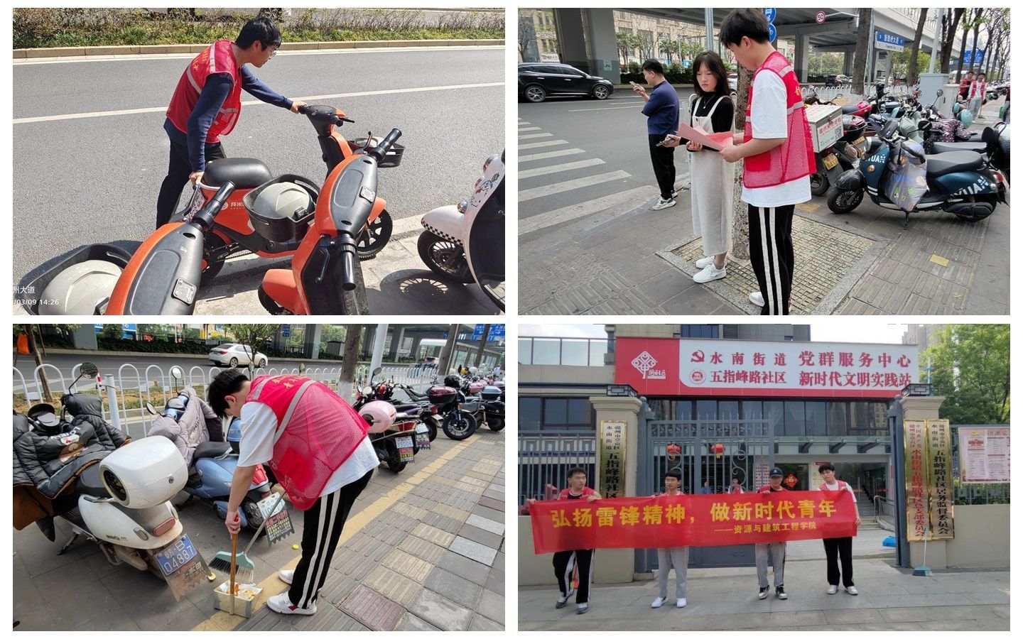 深入社区开展卫生志愿服务活动。建设工程系组织青年志愿者来到水南街道开展为期三周的志愿服务活动,对路面卫生进行清扫,将乱停乱放的非机动车进行整理摆放,对行人宣扬文明城市意识,前往五指峰路社区学习聆听移风易俗宣讲会,加强志愿服务保障与支持。