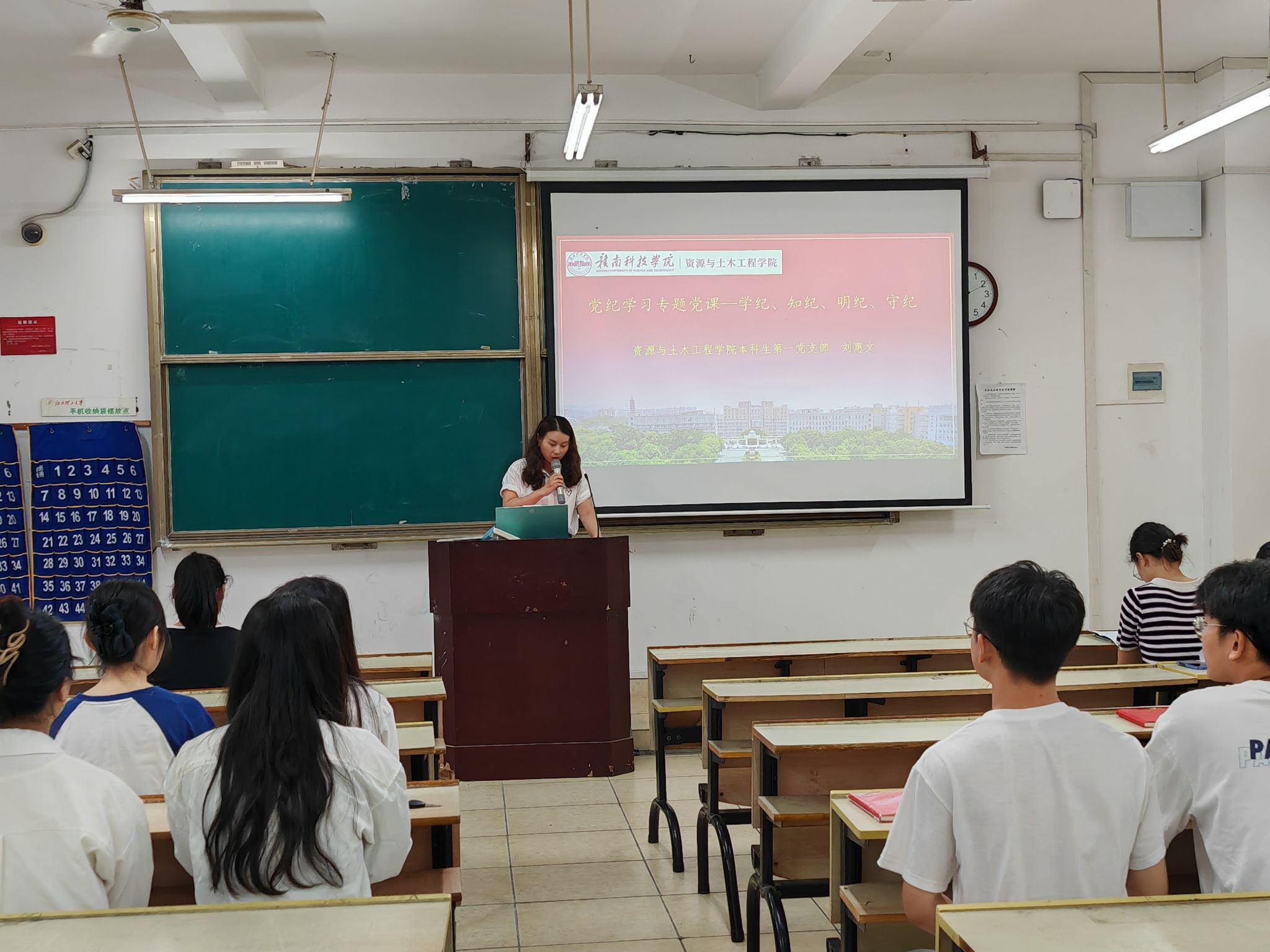本网讯:为切实增强全体党员的党纪意识,提升党性修养。5月31日下午,威廉williamhill本科生第一党支部在Z114开展党纪学习教育专题党课学习,党支部书记刘惠文作了题为《学纪、知纪、明记、守纪》的党课讲授,本科生第一党支部全体党员聆听本次党课。