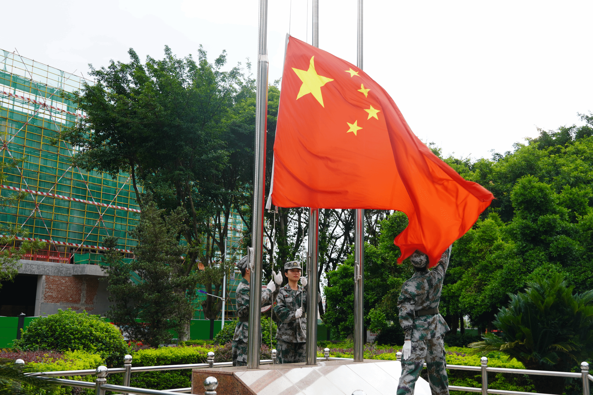 仪式开始,伴随着《义勇军进行曲》的响起,五星红旗冉冉升起,全体参加人员奏唱国歌,向国旗行注目礼。