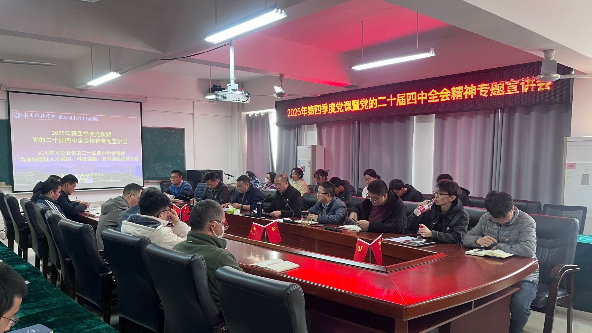 最后,刘俊峰对全体参会人员提出几点要求:一是各党支部要抓好“深学习”,通过多种形式推动全会精神学深悟透;二是全体党员要聚焦“抓落实”,在各自岗位上勇当先锋、做好表率;三是各部门要突出“求实效”,将学习成效体现在学科建设、人才培养、科研转化等具体成果上,为建设教育强国、科技强国、人才强国贡献资土力量。
