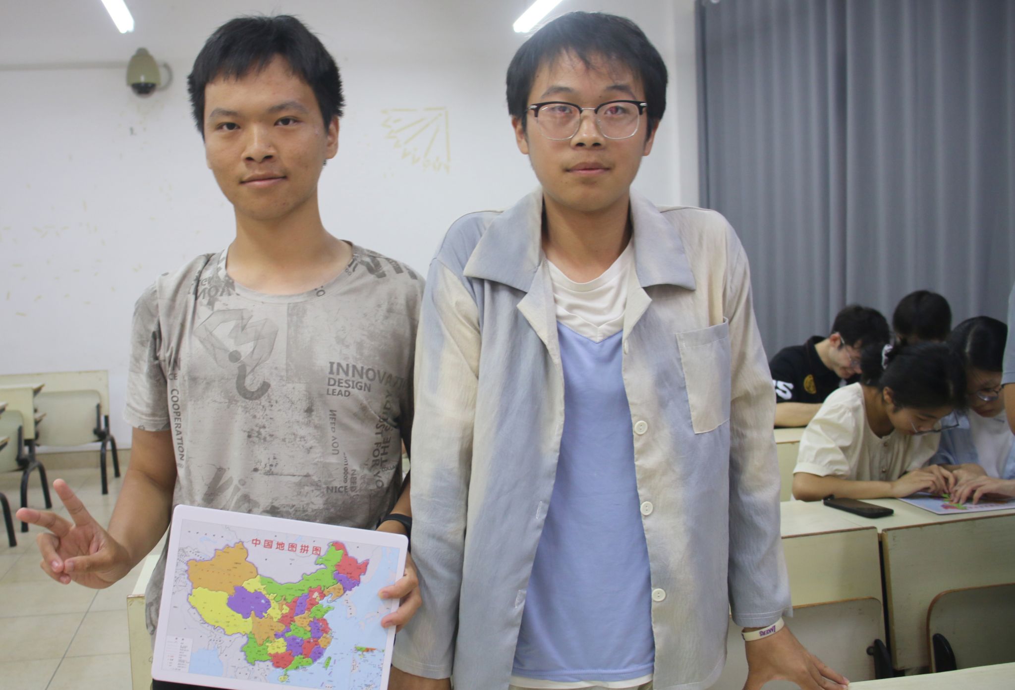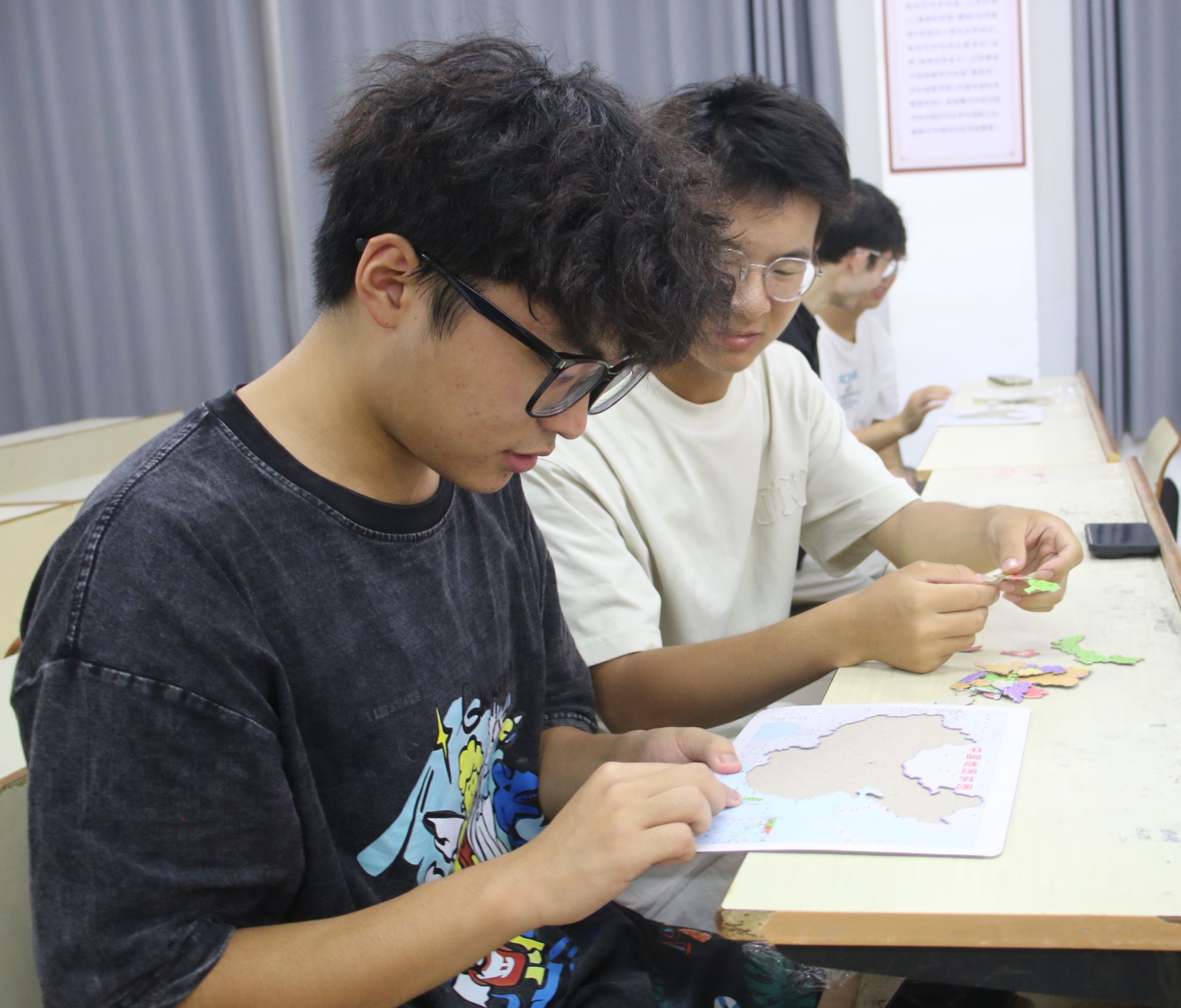地图拼图区里,同学们自愿组队围坐,接过工作人员递来的中国地图拼图便立刻投入:有人比对省份轮廓,有人和队友小声商量拼合顺序,成功嵌对一块时总伴着轻快的欢呼。