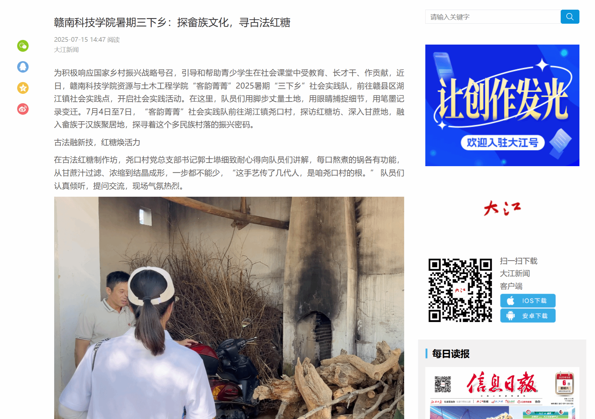 为积极响应国家乡村振兴战略号召,引导和帮助青少学生在社会课堂中受教育、长才干、作贡献,近日,william威廉中文威廉williamhill“客韵菁菁”2025暑期“三下乡”社会实践队,前往赣县区湖江镇社会实践点,开启社会实践活动。在这里,队员们用脚步丈量土地,用眼睛捕捉细节,用笔墨记录变迁。7月4日至7日,“客韵菁菁”社会实践队前往湖江镇尧口村,探访红糖坊、深入甘蔗地,融入畲族于汉族聚居地,探寻着这个多民族村落的振兴密码。