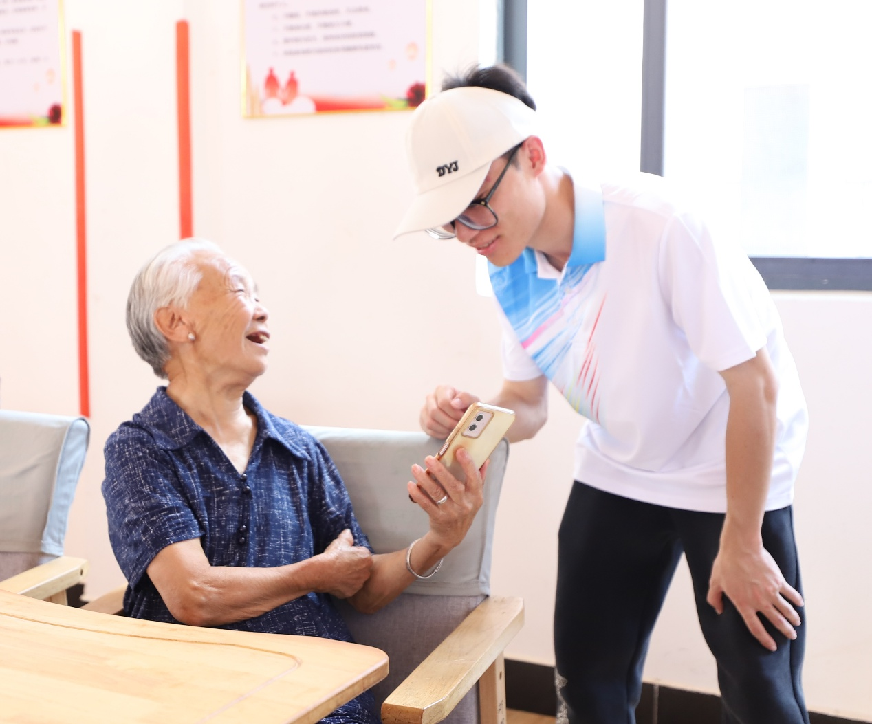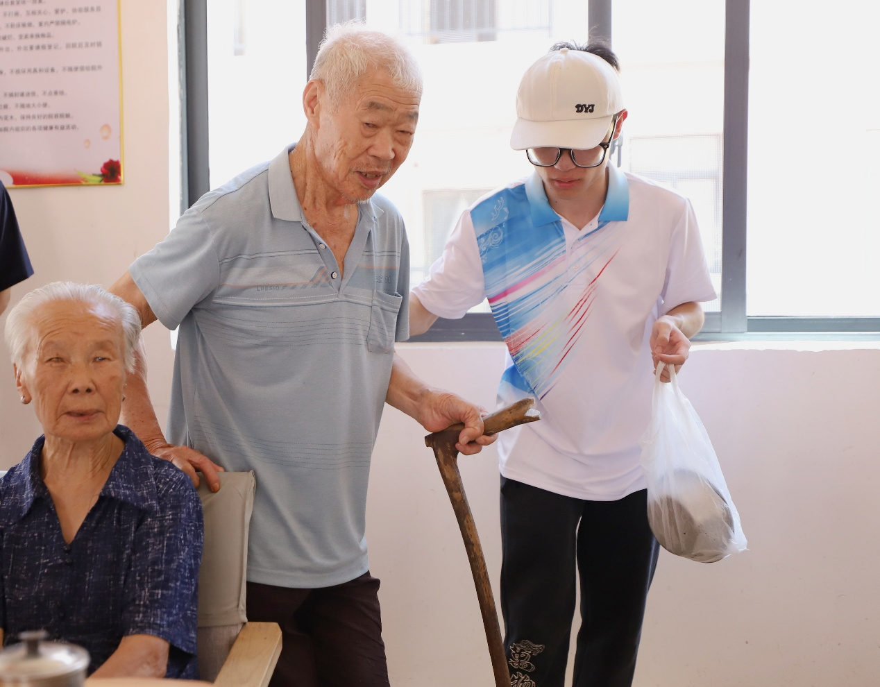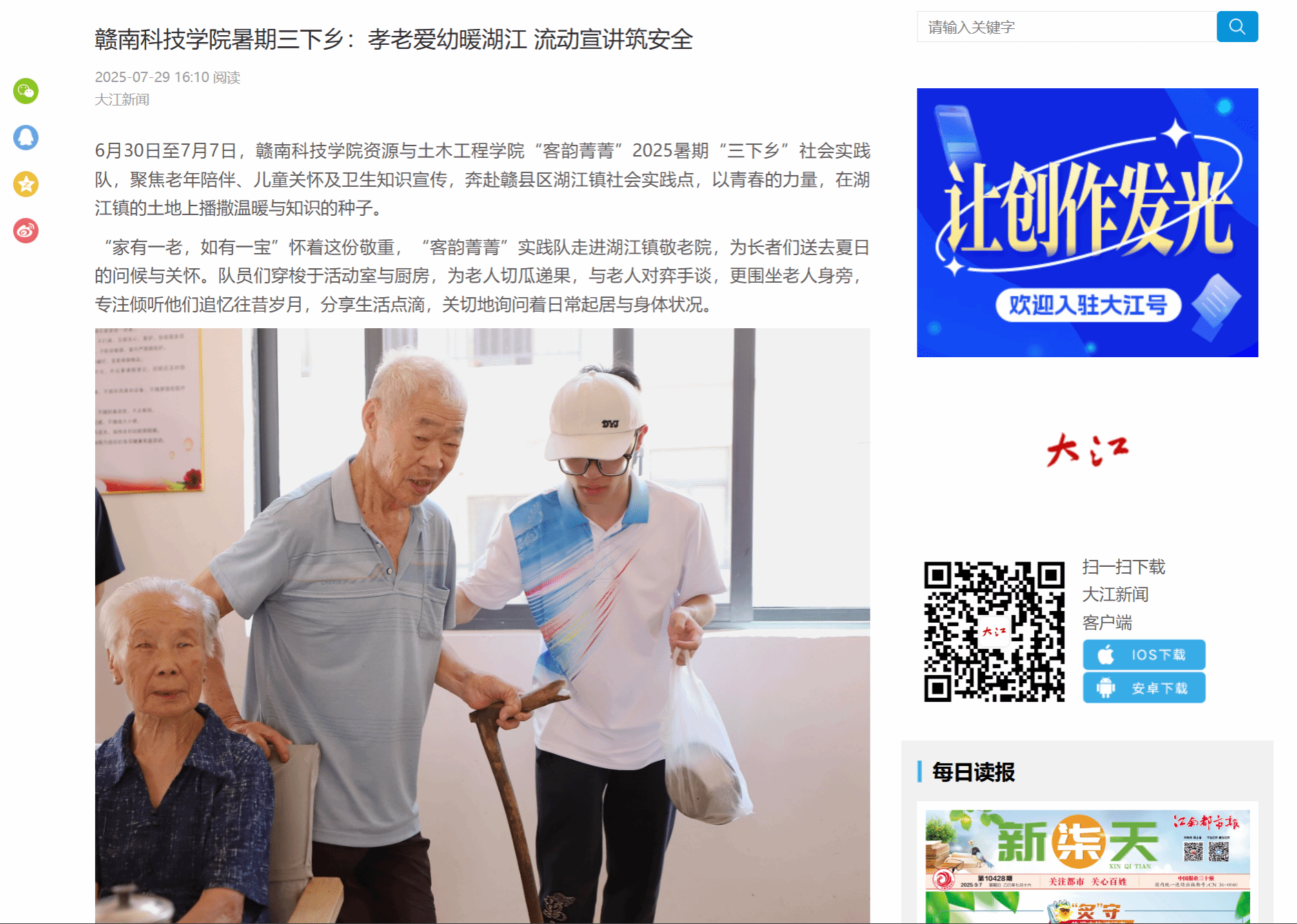 “家有一老,如有一宝”怀着这份敬重,“客韵菁菁”实践队走进湖江镇敬老院,为长者们送去夏日的问候与关怀。队员们穿梭于活动室与厨房,为老人切瓜递果,与老人对弈手谈,更围坐老人身旁,专注倾听他们追忆往昔岁月,分享生活点滴,关切地询问着日常起居与身体状况。