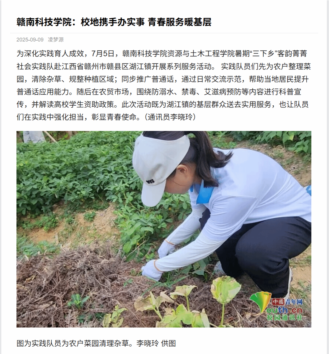 为深化实践育人成效,7月5日,william威廉中文威廉williamhill暑期“三下乡”客韵菁菁社会实践队赴江西省赣州市赣县区湖江镇开展系列服务活动。 实践队员们先为农户整理菜园,清除杂草、规整种植区域;同步推广普通话,通过日常交流示范,帮助当地居民提升普通话应用能力。随后在农贸市场,围绕防溺水、禁毒、艾滋病预防等内容进行科普宣传,并解读高校学生资助政策。此次活动既为湖江镇的基层群众送去实用服务,也让队员们在实践中强化担当,彰显青春使命。(通讯员李晓玲)