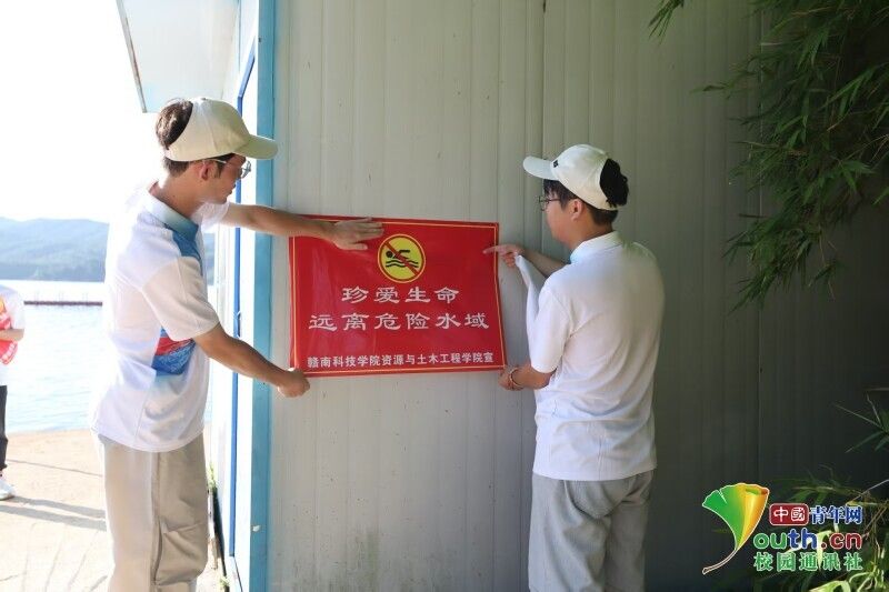 图为实践队员在江边粘贴“防溺水”标语。凌俐 供图