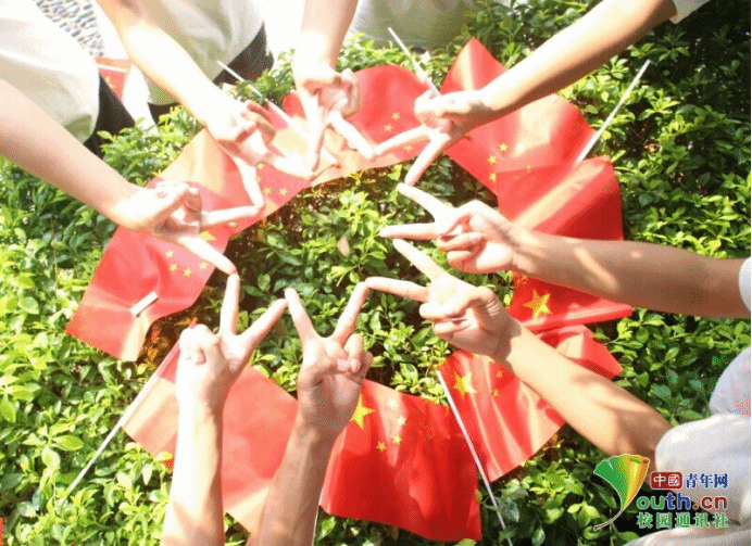 图为同学手拿红旗围坐成爱心形表达对祖国的热爱。李晓玲 郑吉如 供图
