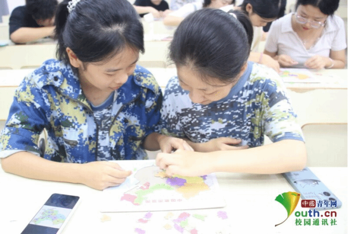 图为同学们专注合力地拼合桌子上的中国版图拼图。李晓玲 郑吉如 供图