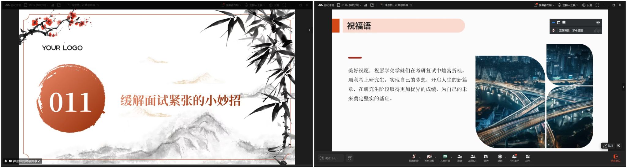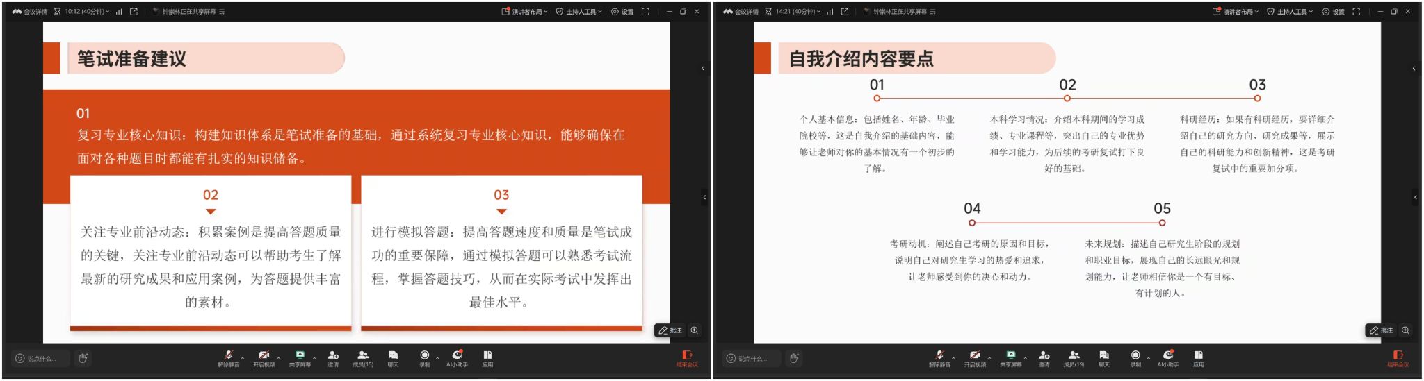 本网讯:为深入推进学风建设,全力帮助考研学子顺利通过复试,3月23日,威廉williamhill借助线上平台举办考研复试指导交流会。本次会议由刘波老师主持,特别邀请了钟崇林、汤燕、左旭超三位在读研究生校友担任主讲嘉宾,为即将踏入复试考场的同学们倾囊相授复试经验。